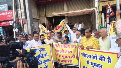 महिलाओं ने धरना दिया, भजन-कीर्तन के साथ विरोध प्रदर्शन